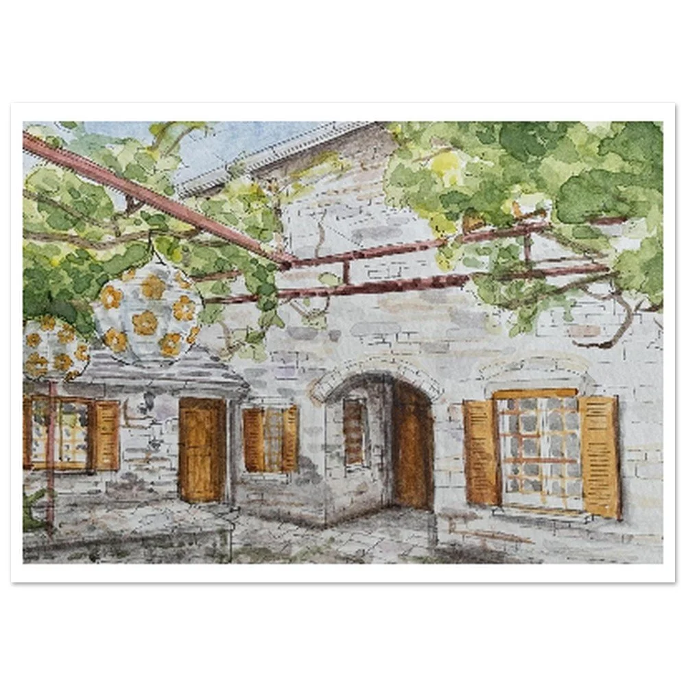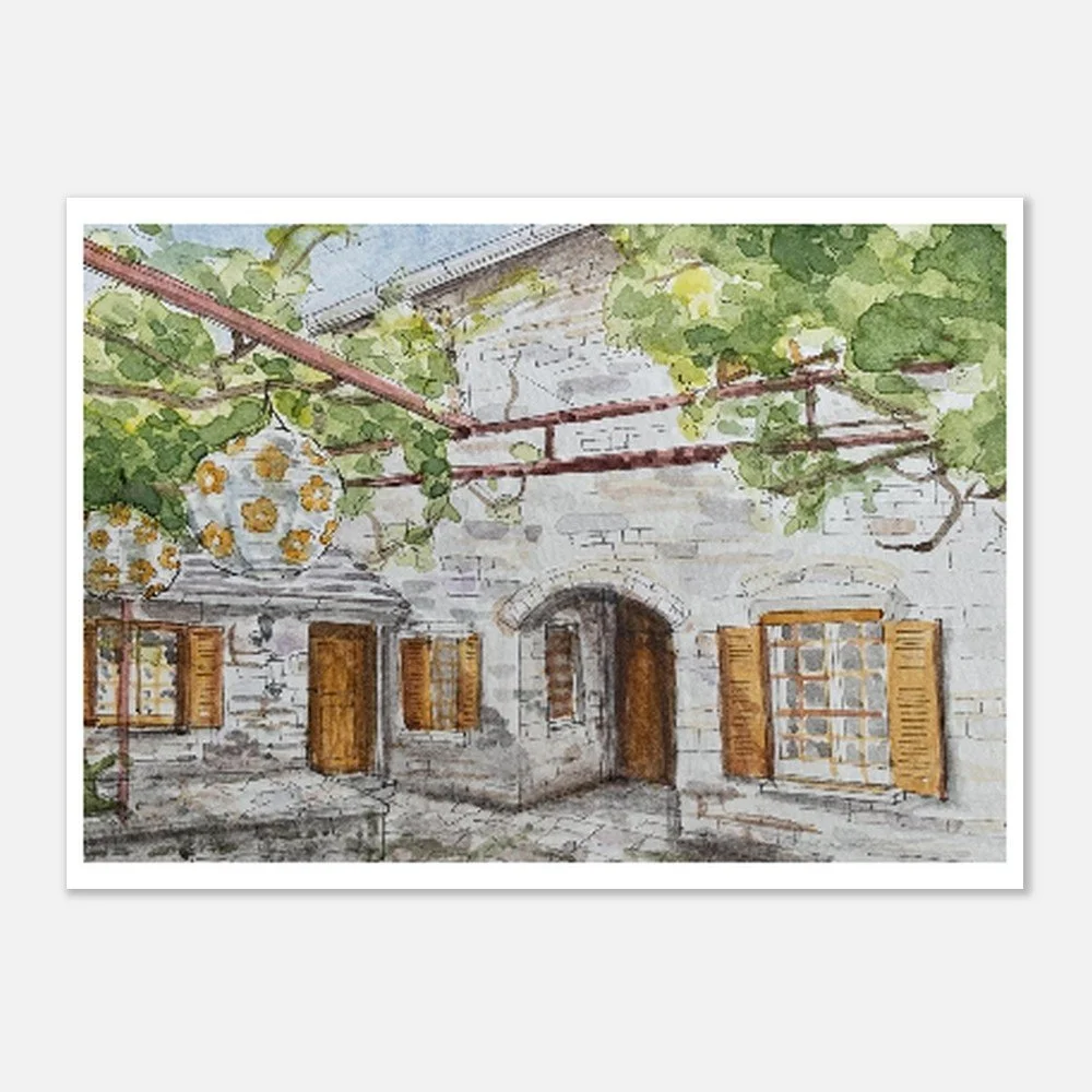 Kato Pedina is a small village in Zagorohoria in the north of Greece. I created this painting with watercolour from a photo I took while staying in the village. I aimed to capture the feeling of warmth, light, and the texture of the stone and foliage.
